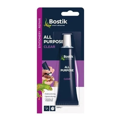 Bostik All Purpose is an ultra strong, quick drying, solvented, clear adhesive.