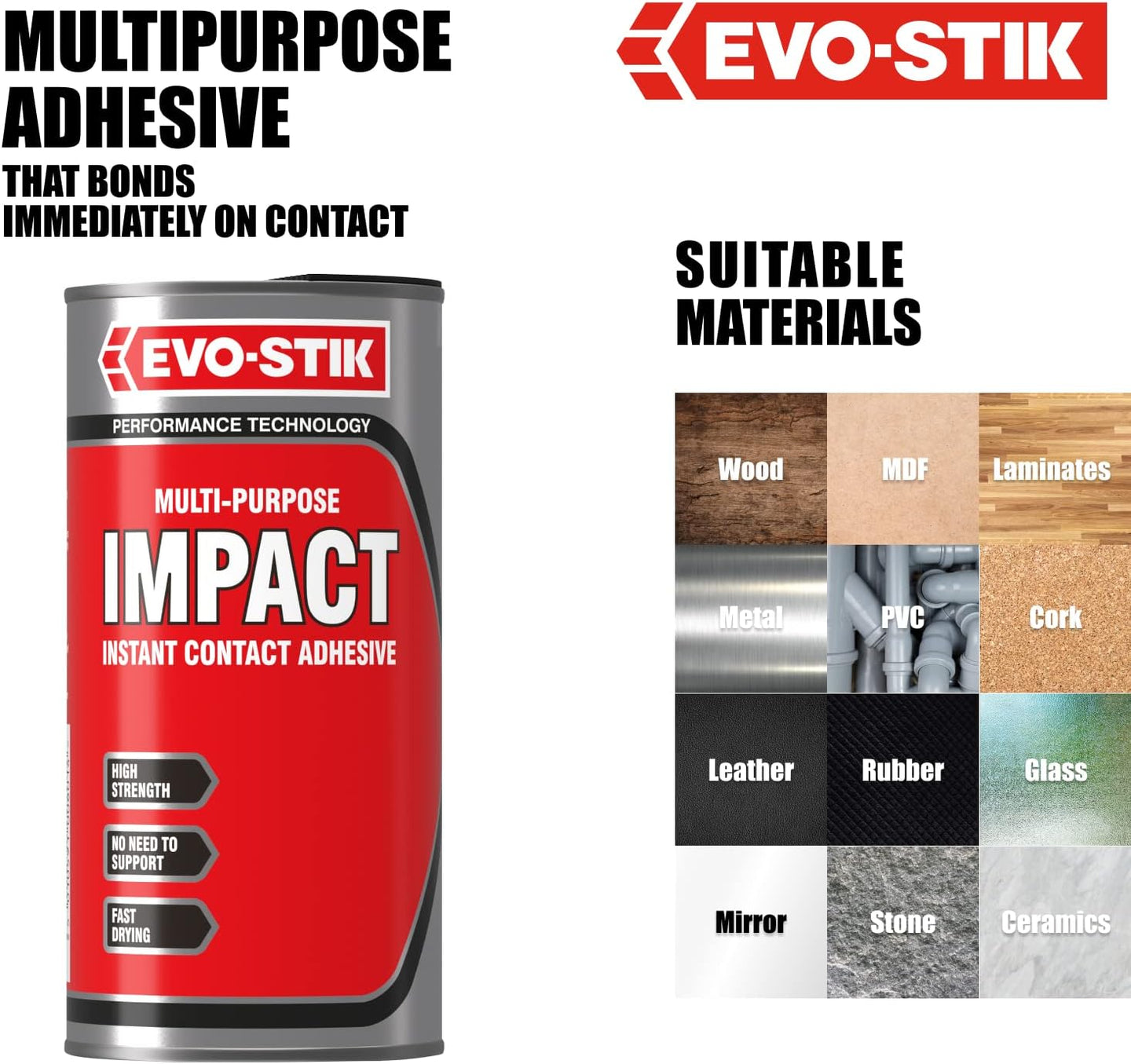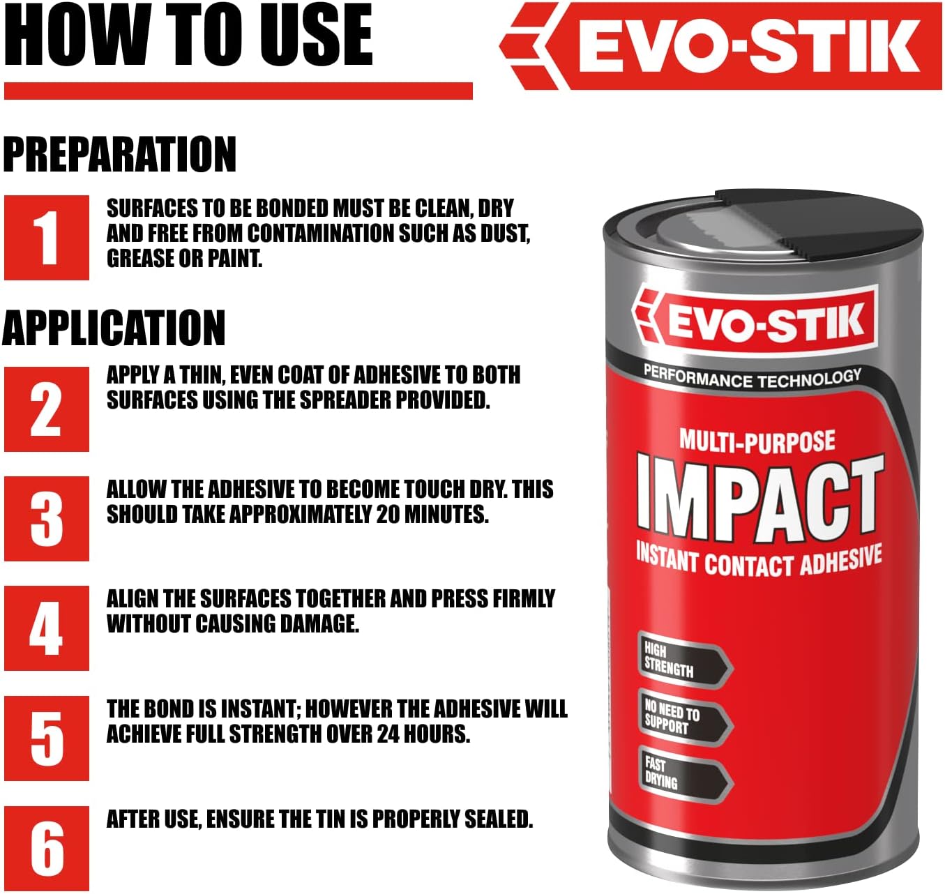 - Contents: 1x EVO-STIK Impact Adhesive, 500ml Tin